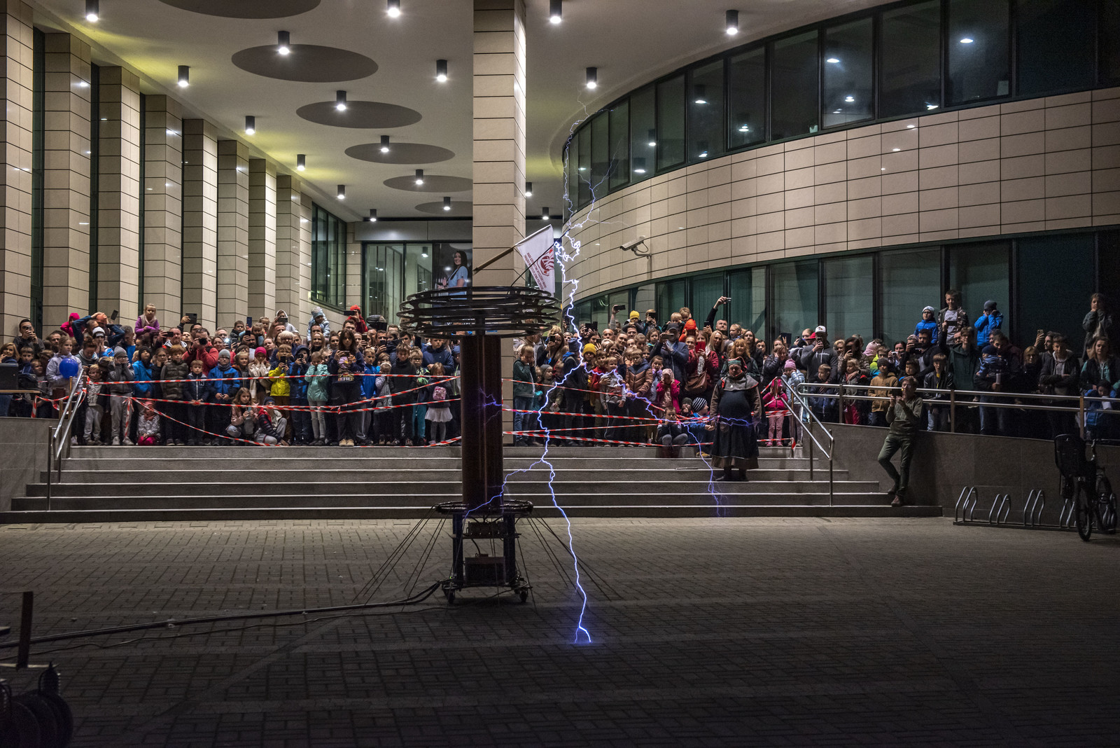 Najbardziej wyczekiwaną atrakcją Nocnych Spotkań z Nauką był „Teatr wysokich napięć”. Podczas spektaklu wykorzystany został jeden z największych w swojej klasie transformatorów Tesli. Był to niecodzienny widok kilkumetrowych wyładowań, które w rytm muzyki rozświetlały mrok.