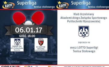 Akademicka drużyna tenisa stołowego Fibrain G2A AZS Politechnika Rzeszów 6 stycznia br. zmierzy się z KS Dartom Bogoria z Grodziska Mazowieckiego.