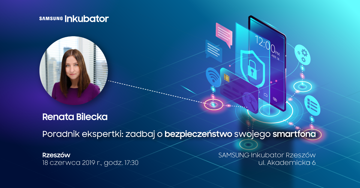 Spotkanie z Renatą Bilecką pt. "Zadbaj o bezpieczeństwo swojego smartfona” odbędzie się 18 czerwca o godz.17:30 w Samsung Inkubator przy ul. Akademickiej 6 w Rzeszowie.