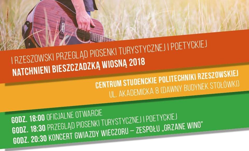 Stowarzyszenie „Natchnieni Bieszczadem” w Cisnej organizuje 26 kwietnia na Politechnice Rzeszowskiej I Podkarpacki przegląd piosenki turystycznej i poetyckiej „Natchnieni Bieszczadzką Wiosną 2018”.