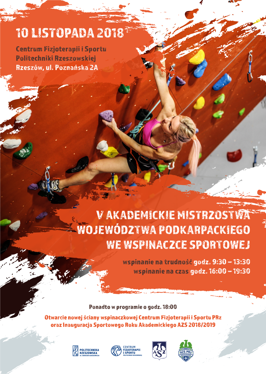 18:00  oficjalne otwarcie ściany wspinaczkowej CFiS PRz i Inauguracja Sportowego Roku Akademickiego