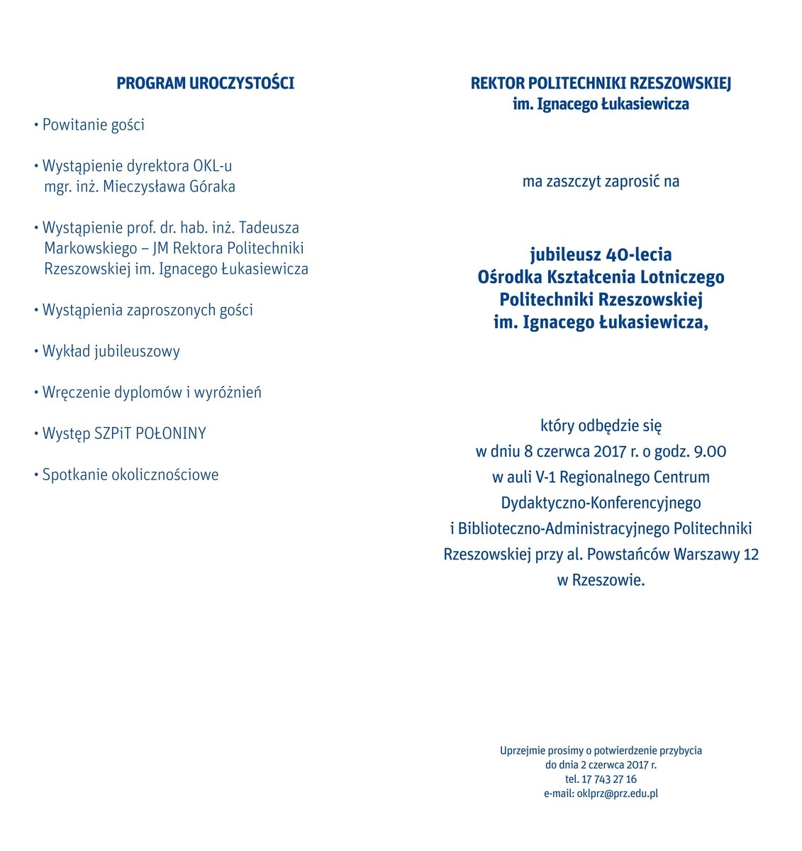 Rektor Politechniki Rzeszowskiej im. I. Łukasiewicza zaprasza na jubileusz 40-lecia Ośrodka Kształcenia Lotniczego. Wydarzenie odbędzie się 8 czerwca br. w auli V-1, początek o godz. 9.00. W programie uroczystości przewidziano m.in.: wystąpienia dyrektora OKL-u i rektora PRz, wykład jubileuszowy oraz wręczenie dyplomów i wyróżnień.